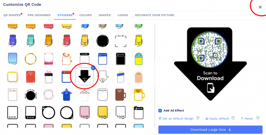 Click on 'Design Color and Decorate QR Code' to customize your QR Code design (ex: adding color, shape, sticker). Note: Click on the 'x' icon of the 'Customize QR Code' popup to save changes.