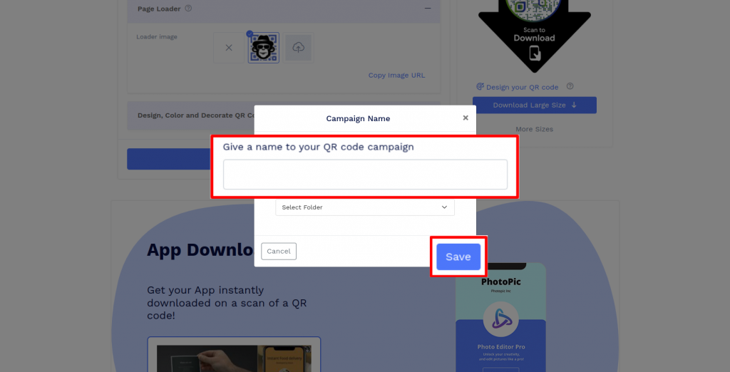 Save the QR Code by clicking on the 'Save QR Code' button, entering the QR name, and then clicking on 'Save.' Note: Make sure to scan your QR Code from different devices (iOS and Android) before printing for production.