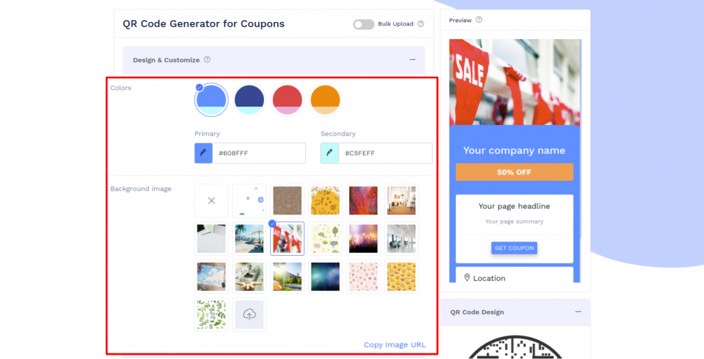 Design and customize the Coupon display page with colors and the background image of your choice.