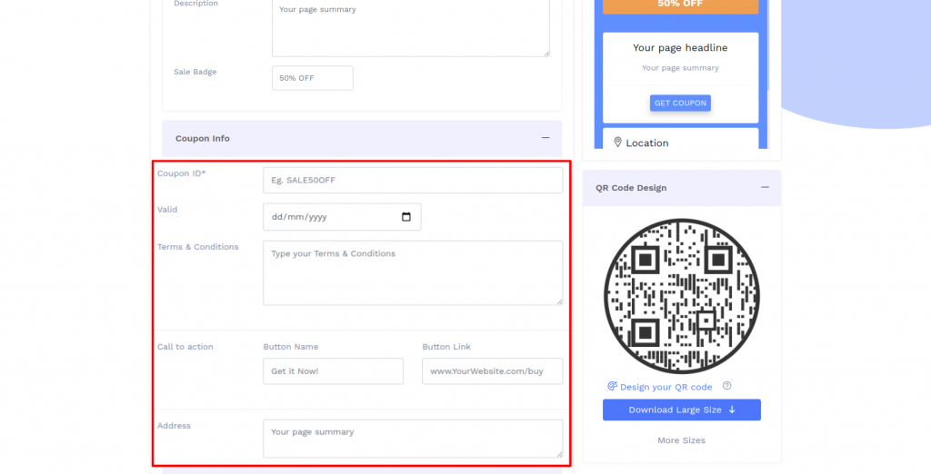 A coupon QR code allows you to offer discount coupons to your customers. Upon scanning, users get redirected to a coupon page with a ‘Get Coupon’ button. They can click on it to view the Coupon ID, validity, terms & conditions, etc., and claim the coupon.